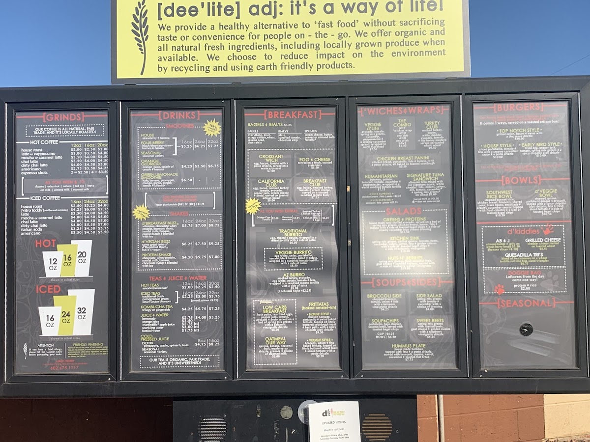 Welcome to d'Lite Healthy On The Go - Phoenix, a vibrant dining spot located at 5502 N 7th Ave, specializing in delicious, health-focused fare. Their menu shines with an assortment of tasty wiches and wraps, like the mouthwatering Turkey Club featuring smoked turkey and creamy avocado, or the robust Chicken Pesto served hot on toasted sourdough. For burger lovers, the House Style Burger offers a hearty black bean and quinoa patty drizzled with tzatziki, all perfectly complemented by fresh veggies.